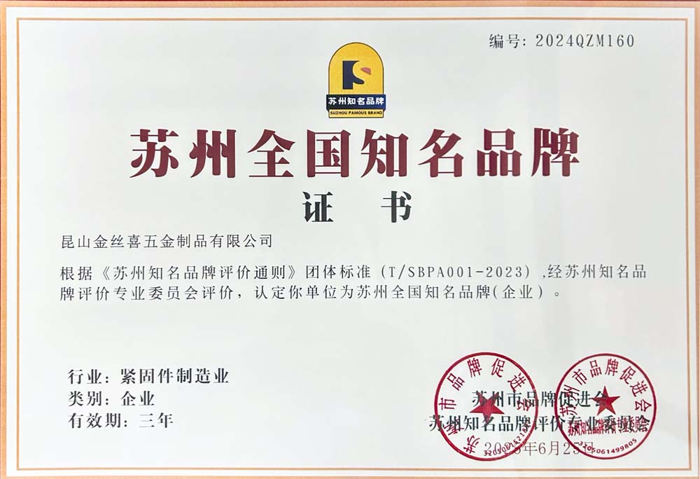KunshanJinsixiMetalware Co., Ltd., mükemmel ürün kalitesi, önde gelen teknolojik gücü, kapsamlı hizmet sistemi ve kapsamlı pazar etkisi nedeniyle resmi olarak "Suzhou'daki Ulusal Ünlü Marka" unvanını aldı!